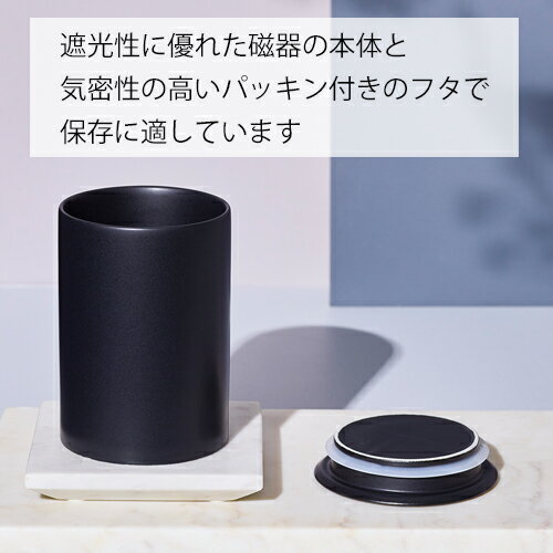 遮光性に優れた磁器の本体と、パッキン付きで気密性の高いフタがコーヒー豆の保存に適しています。