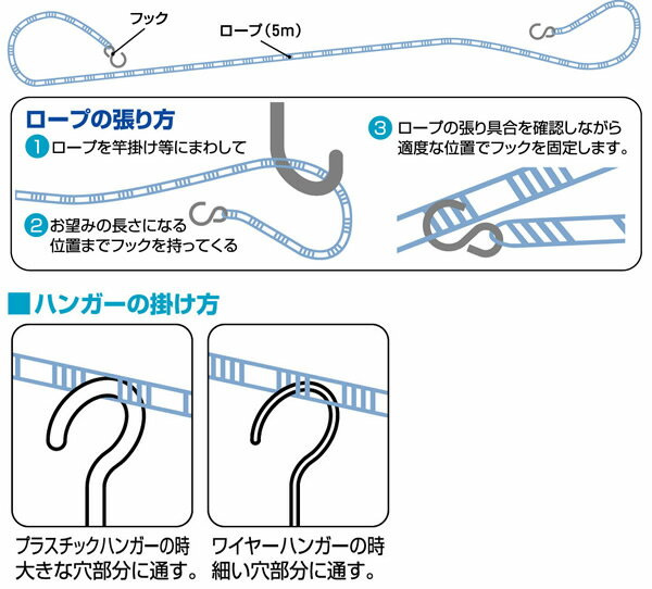 ロープをポールや竿掛けなどにくくって折り返し、先端のフックをロープに引っ掛けて固定することで、長さ調節が可能。