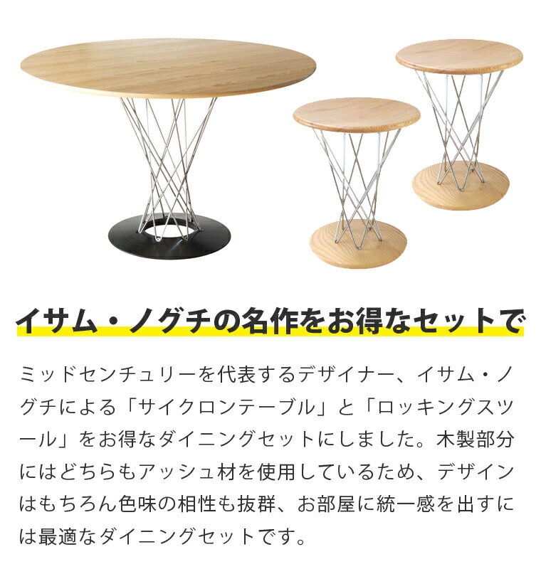 ミッドセンチュリーを代表するデザイナー、イサム・ノグチによる「サイクロンテーブル」と「ロッキングスツール」をお得なダイニングセットにしました。